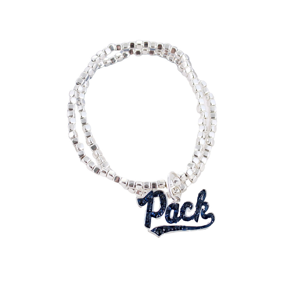 Represent The Wolf Pack with the Script Pack Crystal Bracelet! This stylish University of Nevada glitter enamel stretch bracelet features two silver tone faceted bead strands connected with a crystal Script Pack glitter enamel charm. The comfortable stretch fit makes it easy to put on and wear alone or stack with other bracelets.