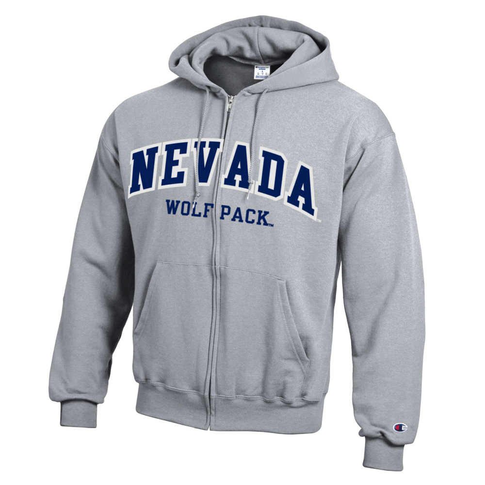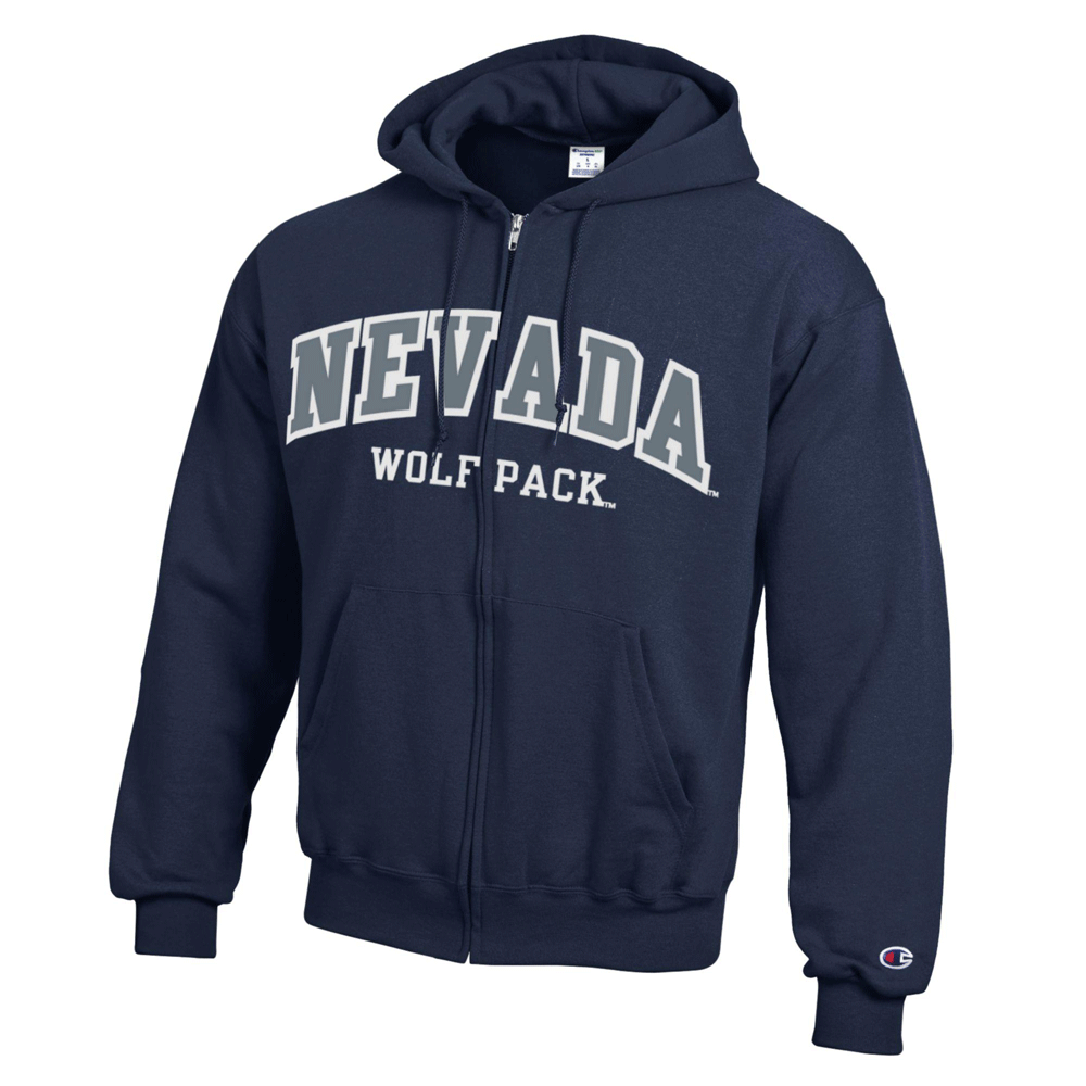 Stay comfortable and warm while representing the Wolf Pack with the Champion Full Zip Hoodie! This men's full zip sweatshirt is Champion brand, is made of their famous 50% cotton / 50% polyester powerblend fleece material, and features an embroidered design proudly showcasing an arched "Nevada" wordmark along with "Wolf Pack" underneath. Available in navy, grey, or black - Go Pack!