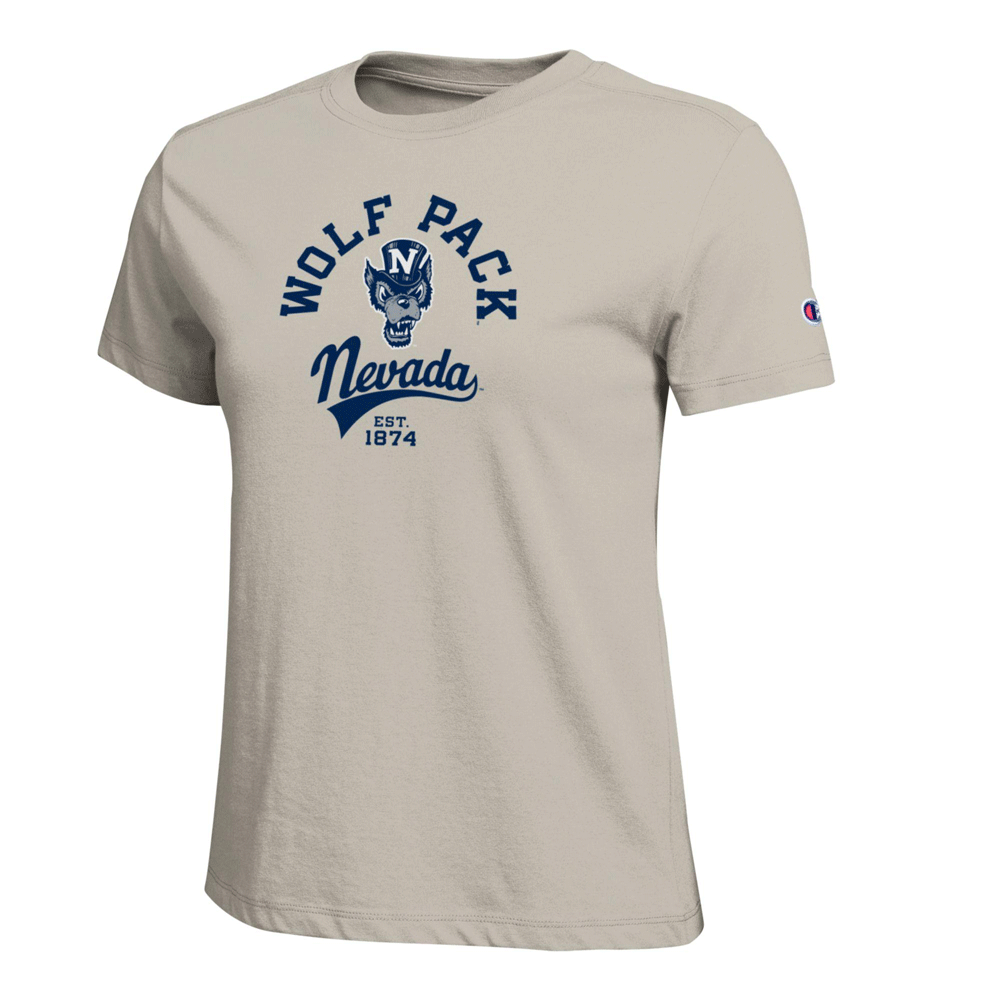 Represent the Wolf Pack in style with the Over The Top Tee! This cocoa butter colored women's t-shirt is made of a comfortable cotton / polyester blend and features a screenprinted design proudly showcasing a throwback Top Hat Wolf logo along with an arched "Wolf Pack" wordmark, script "Nevada" wordmark, and "Est. 1874".