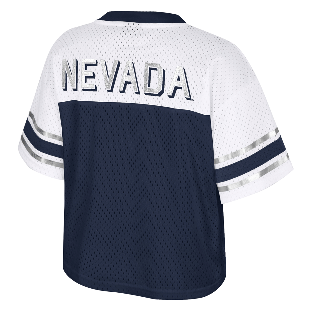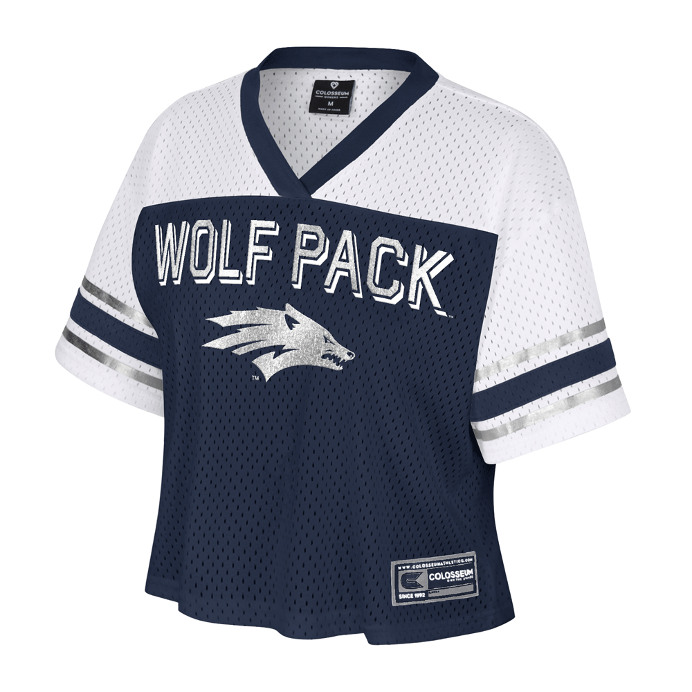 Add some Wolf Pack flair to your wardrobe with the Posh Jersey! This women's football jersey is made from 100% polyester heavy mesh and features a printed design with metallic accents proudly showcasing a primary Sport Wolf logo with a "Wolf Pack" wordmark up front, along with a "Nevada" wordmark across the back. Perfect for tailgating and game day - Go Pack!
