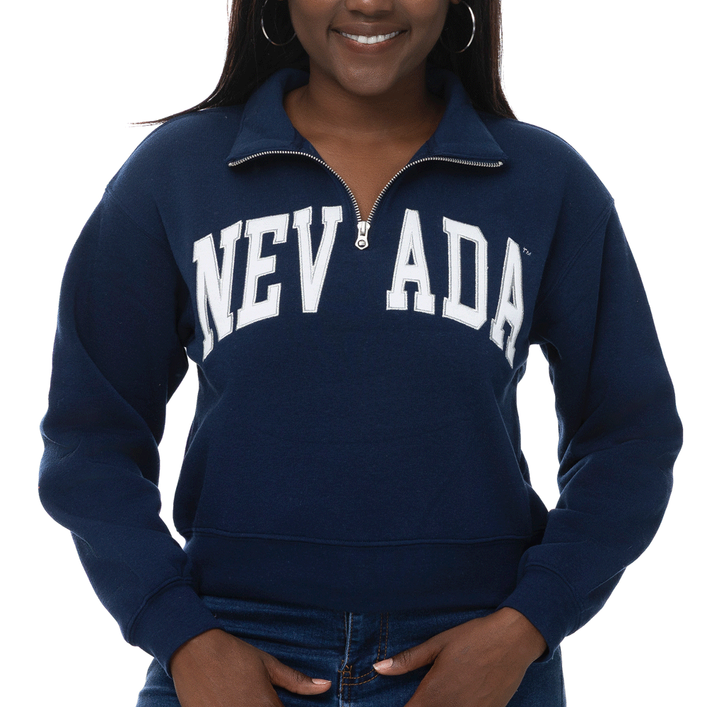 Stay stylish with the Silver State Crop Quarter Zip! This cute women's quarter zip is slightly cropped, made of a 76% polyester/24% cotton blend. and features embroidered details proudly showcasing an arched "Nevada" wordmark outlined in silver! Perfect for class or game day - Go Pack!
