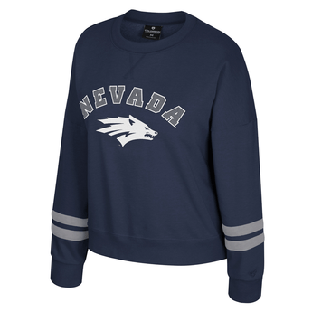 Show off your Wolf Pack pride with the Sleeve Stripes Crew! This women's crewneck sweatshirt is made of a cotton / polyester blend, features dropped shoulders, applique sleeve stripes, and an embroidered design proudly showcasing a white Sport Wolf logo with a grey and white arched "Nevada" wordmark. Go Pack!