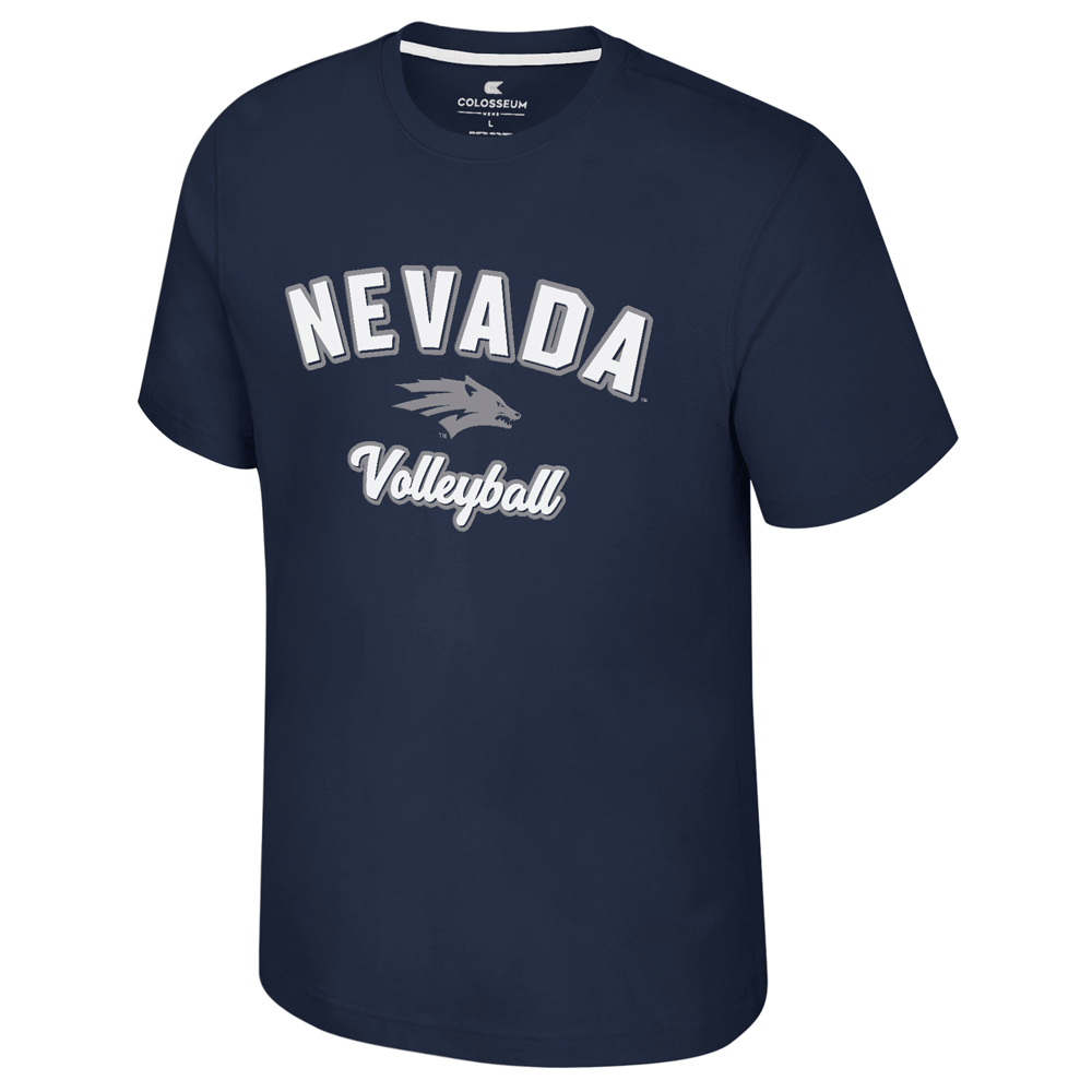 Represent the Wolf Pack Volleyball team with the Side Out Tee! This men's t-shirt is made of a comfortable cotton/polyester blend and features a screenprinted design pairing a grey Sport Wolf logo with an arched "Nevada" wordmark and "Volleyball" in a stylized script. Go Pack!