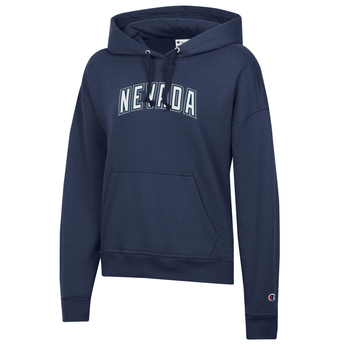 Represent the Wolf Pack in style with the Arch Nevada Glitter Hood! This Champion women's sweatshirt is made of a comfortable cotton/polyester powerblend fleece and features a embroidered glitter design proudly showcasing an Arched Nevada wordmark. Perfect for gameday - Go Pack!