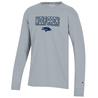 Let your young Wolf Pack fan show their support with the Youth Flyover LS! This youth sized long sleeve shirt is made of a 60% cotton / 40% polyester blend and features a screen printed design proudly showcasing a stylized "Wolf Pack" wordmark paired with a Sport Wolf logo as well as stylized "Nevada Wolf Pack" wordmarks on the back paired with a Top Hat Wolf logo. Go Pack!