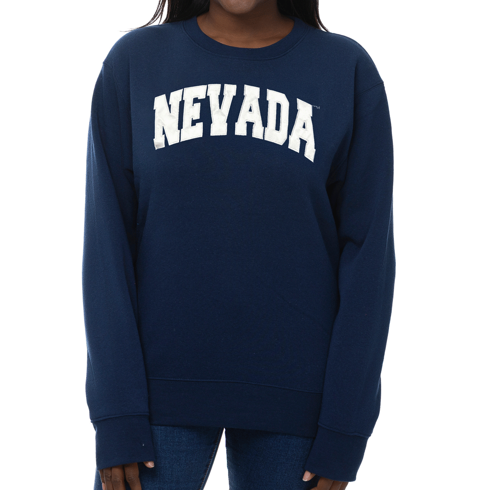 Represent the Wolf Pack in comfort and style with the Satin Crew! Available navy, grey, or black; this comfy women's crewneck sweatshirt is made of a 76% cotton/24% polyester blend and features a high quality embroidered design up front - proudly displaying the word "Nevada" in satin collegiate block lettering. Go Pack!