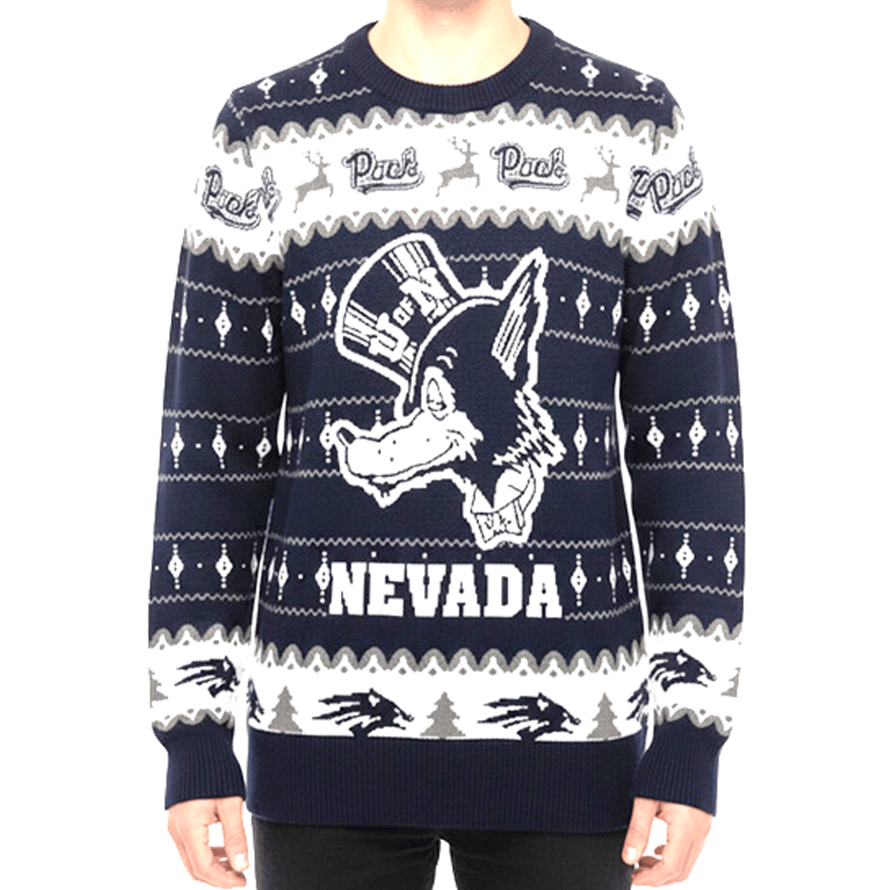 Deck the halls and represent the Wolf Pack with the Men's Vintage Christmas Sweater! This is the 2025 version of our "Ugly" Christmas Sweater and is an exclusive collaboration with Tipsy Elves! Made of 100% knit acrylic fabric, this sweater features a classic holiday design showcasing reindeer and Script Pack logos towards the top, Christmas trees and Sport Wolf logos towards the bottom, and a vintage 1970's vault Wolf Pack logo with a "Nevada" wordmark.